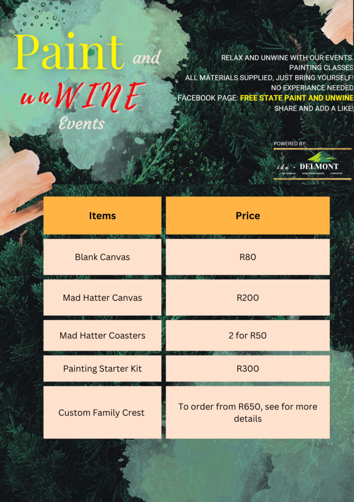 Relax and unwine with our events and painting classes. All materials are supplied, just bring yourself!